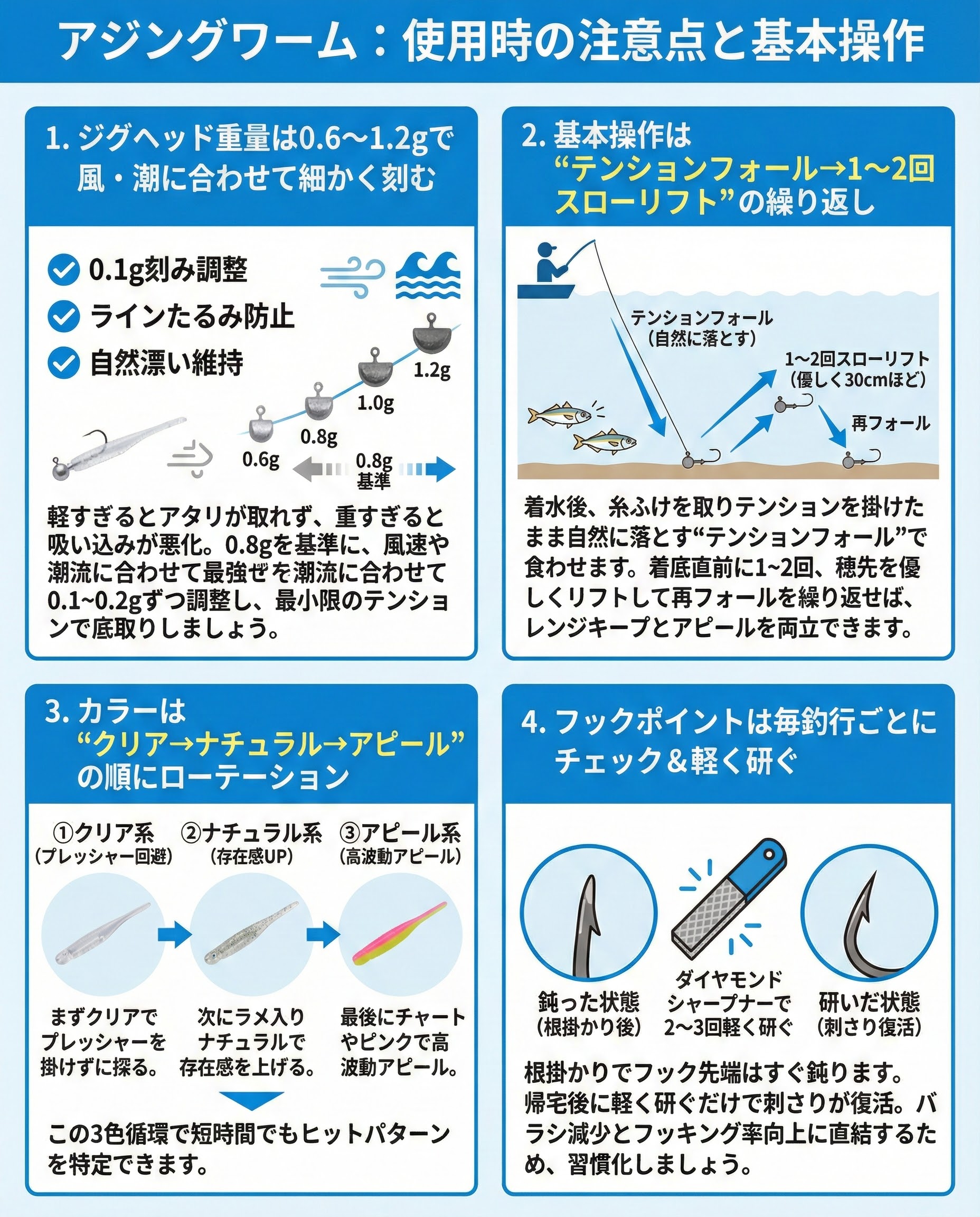 ジグヘッド重量は0.6〜1.2 gで風・潮に合わせて細かく刻む
