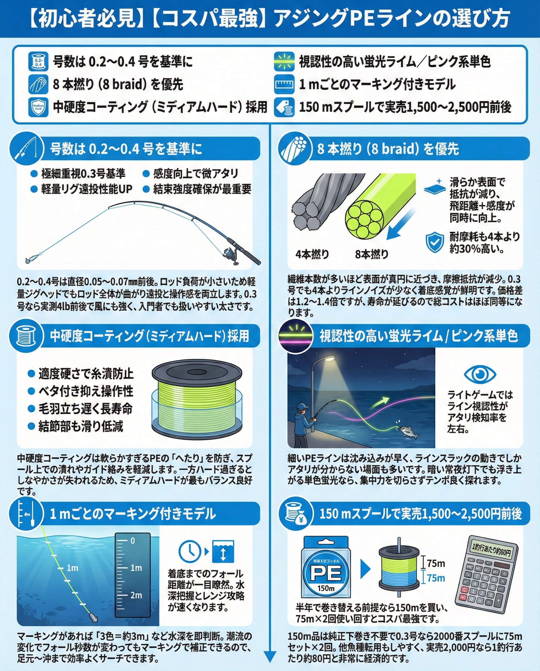 アジングで釣果を伸ばすなら感度と強度を重視したPEライン選びが重要です。本記事は「細いのに強い・扱いやすい・安い」をすべて満たすコスパ最強の選択基準と、おすすめ製品・使用時の注意点をまとめました。