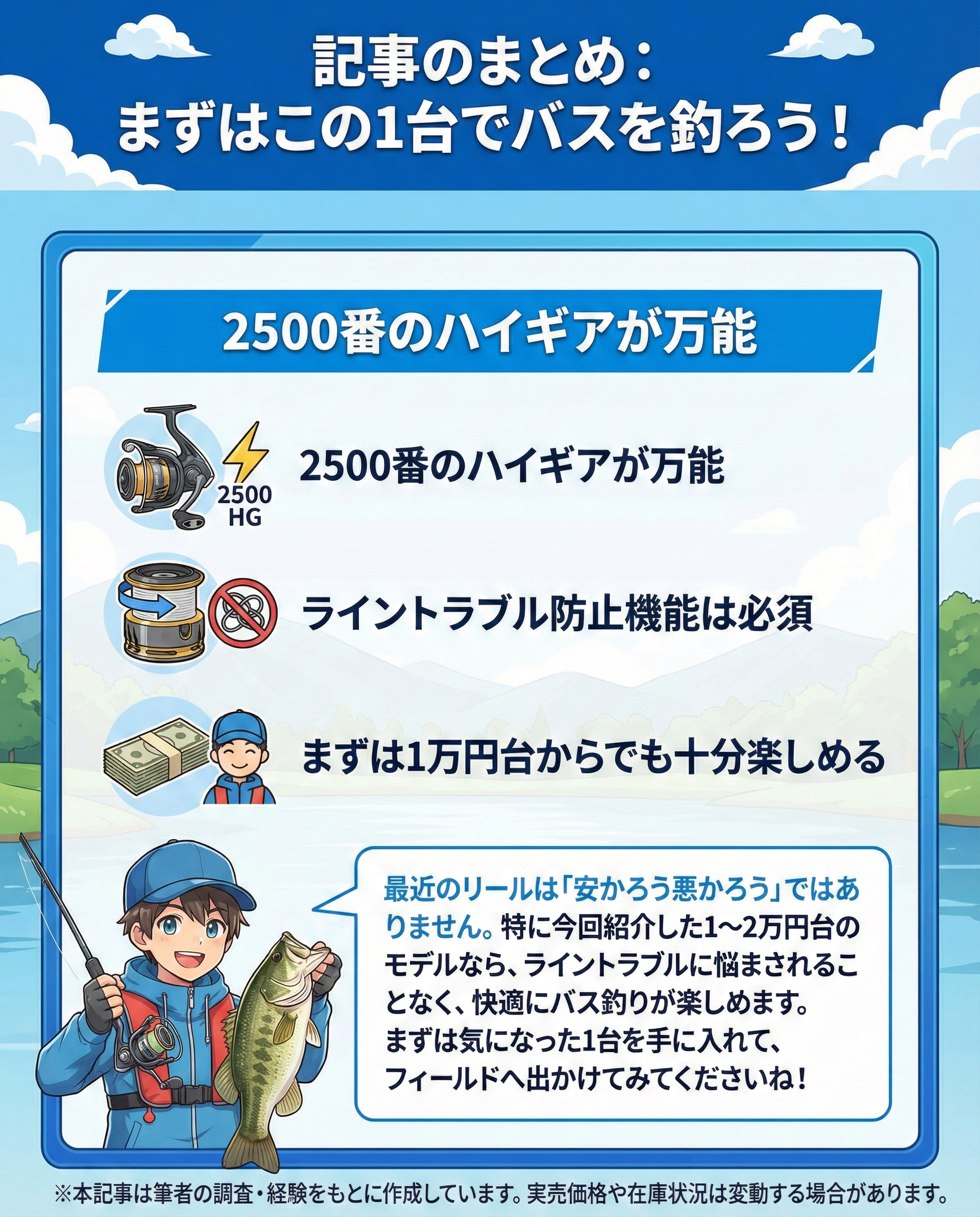 記事のまとめ:まずはこの1台でバスを釣ろう!最近のリールは「安かろう悪かろう」ではありません。特に今回紹介した1〜2万円台のモデルなら、ライントラブルに悩まされることなく、快適にバス釣りが楽しめます。まずは気になった1台を手に入れて、フィールドへ出かけてみてくださいね! ※本記事は筆者の調査・経験をもとに作成しています。実売価格や在庫状況は変動する場合があります。