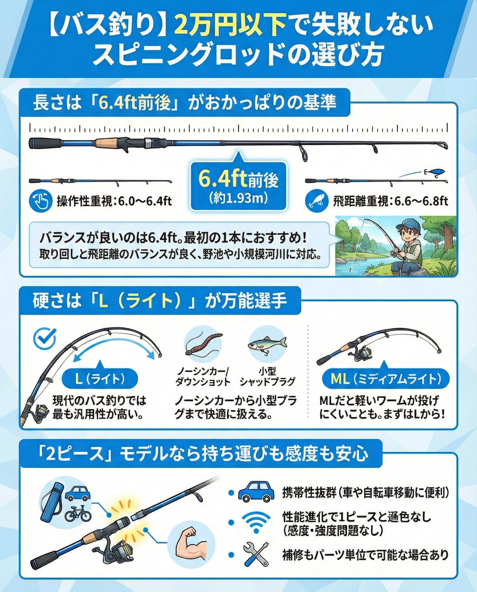 最近の3万円以下のロッドは、一昔前の上位機種に匹敵するハイスペック揃い。まずは6.4ftのLパワーから始めて、自分のスタイルに合わせて使い分けてみてください!
