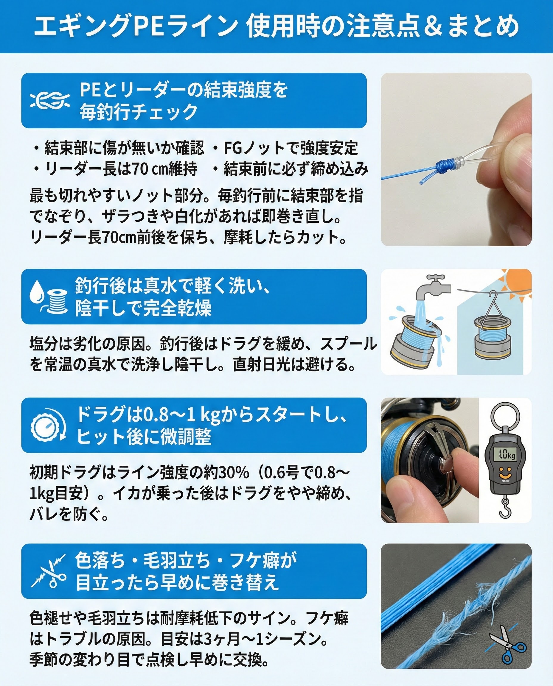 以上を押さえれば、初心者でもライン由来のトラブルを大幅に削減し、エギ操作とアタリ取りに集中できます。コスパを重視しつつ、安全第一で楽しいエギングライフを!