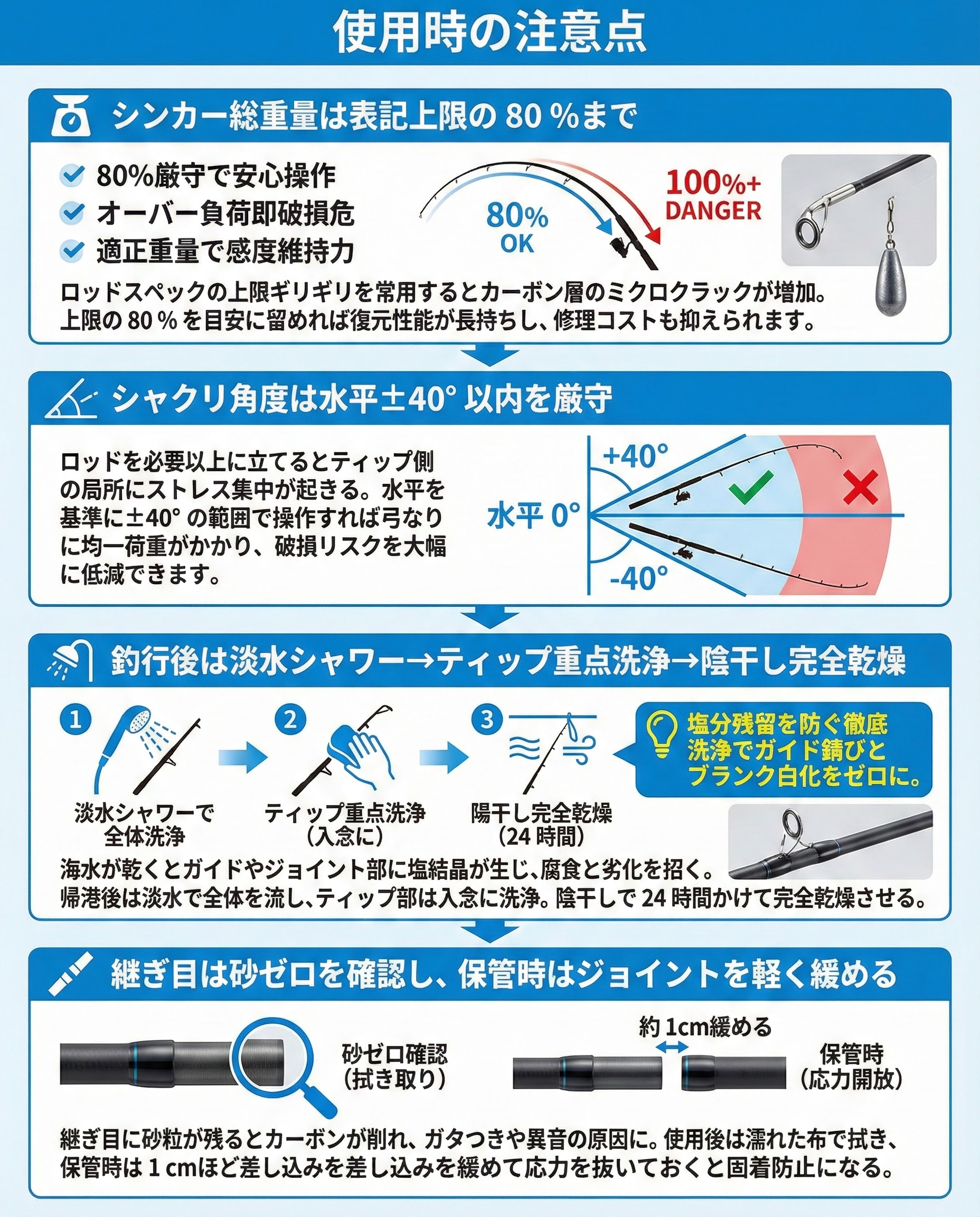 海水が乾くとガイドやジョイント部に塩結晶が生じ、金属腐食と樹脂劣化を招きます。帰港後は淡水で全体を流し、ティップ部はシャワー+スポンジで入念に洗浄。陰干しで24 時間かけて完全乾燥させましょう。