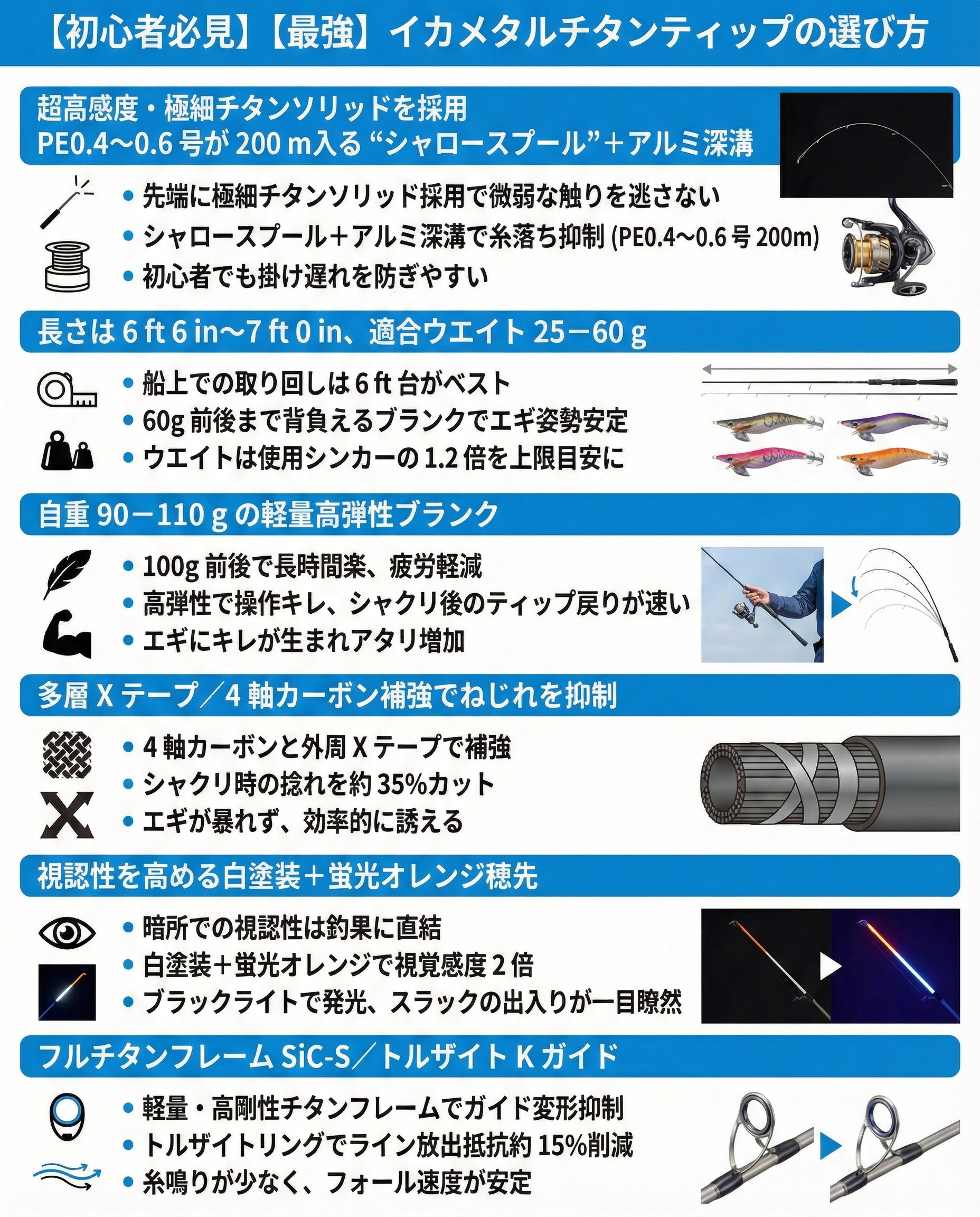 イカメタル初心者が「感度」と「操作性」を両立させたい場合は、チタンティップ搭載ロッドを選ぶことです。本記事ではその最適条件とおすすめモデル、安全な取り扱い方まで網羅します。