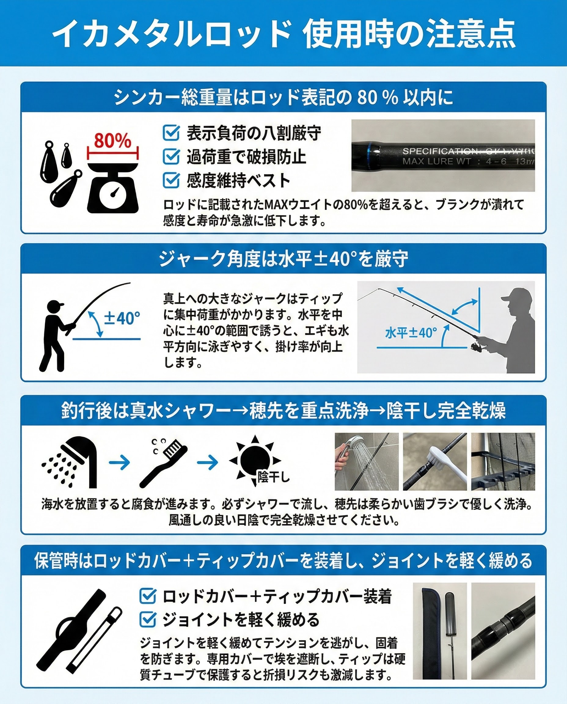 上記ポイントを押さえれば、初めてのイカメタルでもアタリを確実に掛けられます。道具の性能を100%引き出すにはメンテと保管も同じくらい重要です。ぜひ本記事を参考に、快適で安全なイカメタルデビューを楽しんでください。